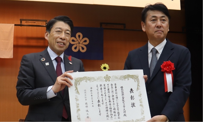 ▲知事、受賞事業所の株式会社ホンダモビリティ九州 波多野浩一 人事部部長