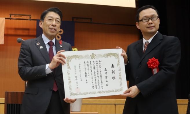 ▲知事、受賞者の山﨑崇弘氏
